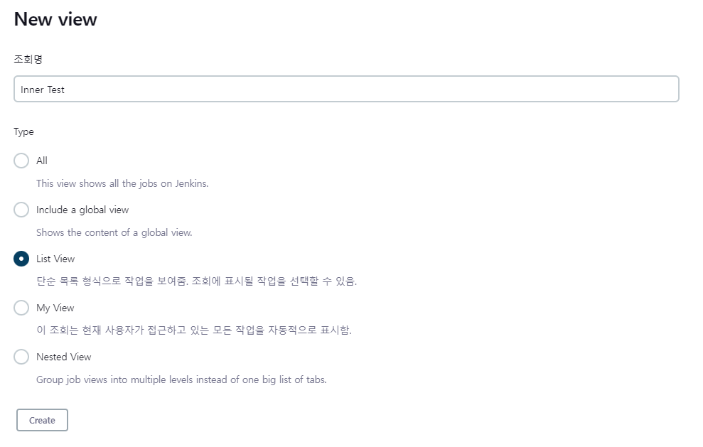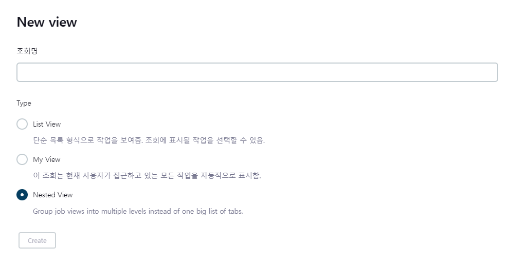 2. view 이름을 입력하고 Type을 Nested View를 선택하고 create 버튼을 누른다.