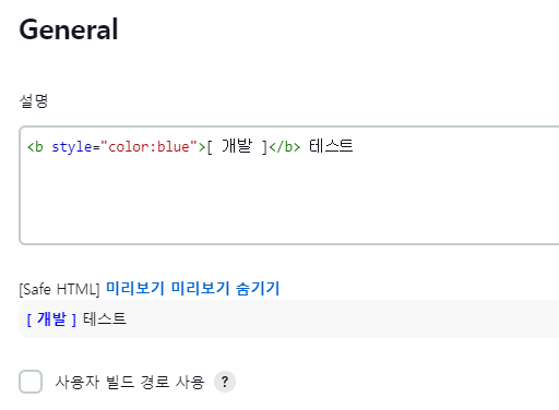 저장을 하고 Item 구성으로 들어가 설명칸에 아래와 같이 HTML 형식으로 작성을 하면 정상적으로 적용된다!