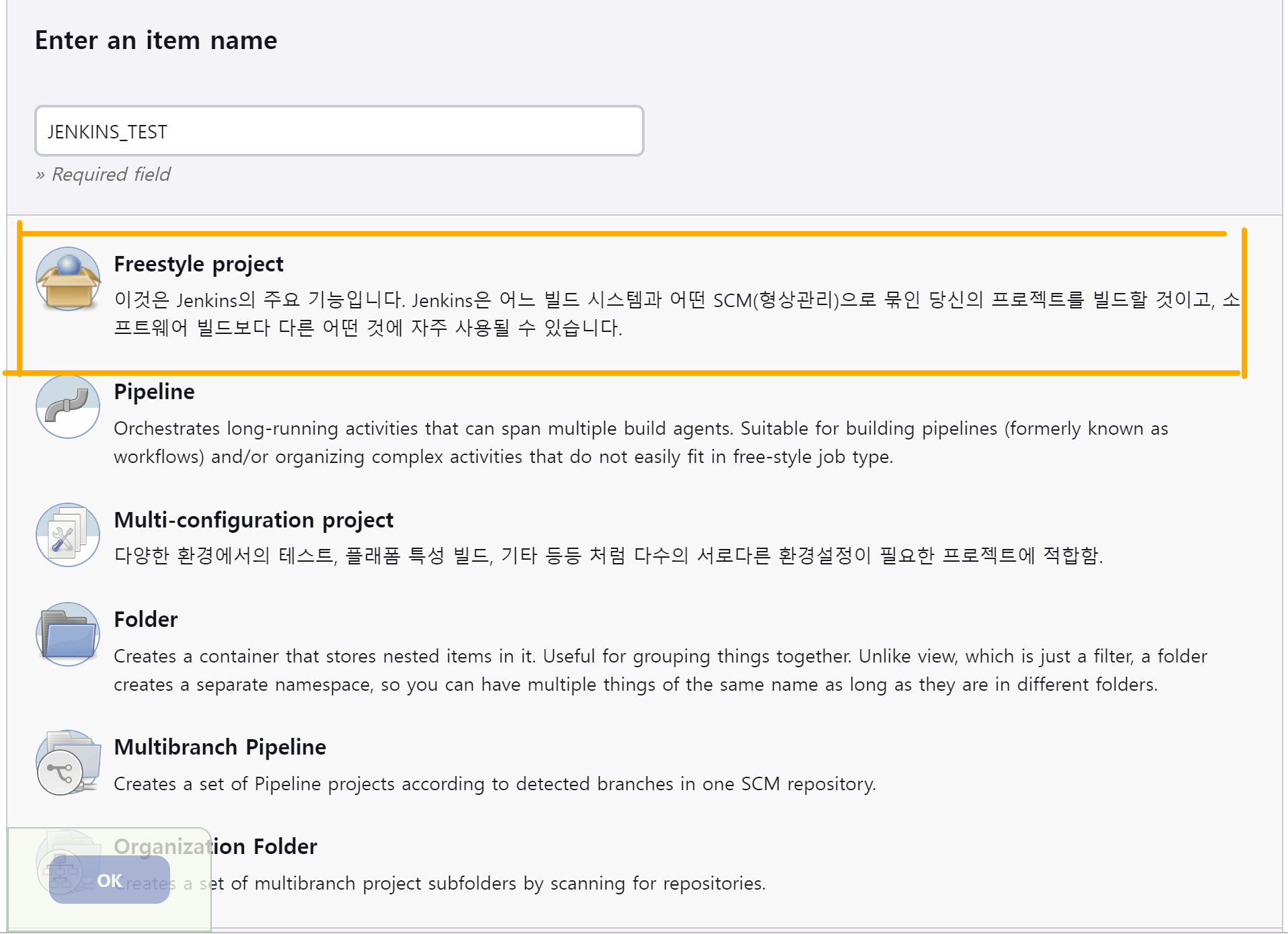 2. Item의 이름을 입력하고 Freestyle project를 누른다.