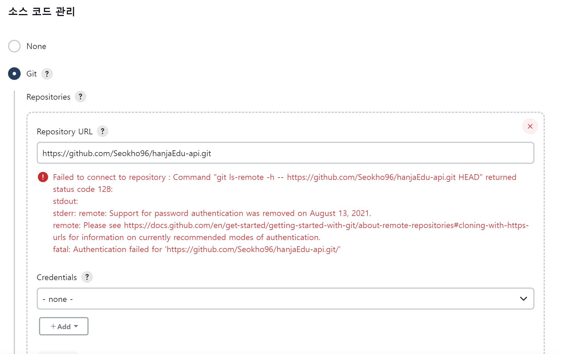 5. Add를 눌러서 Jenkins를 선택하고 아래 항목들을 입력하고 Add를 누른다.