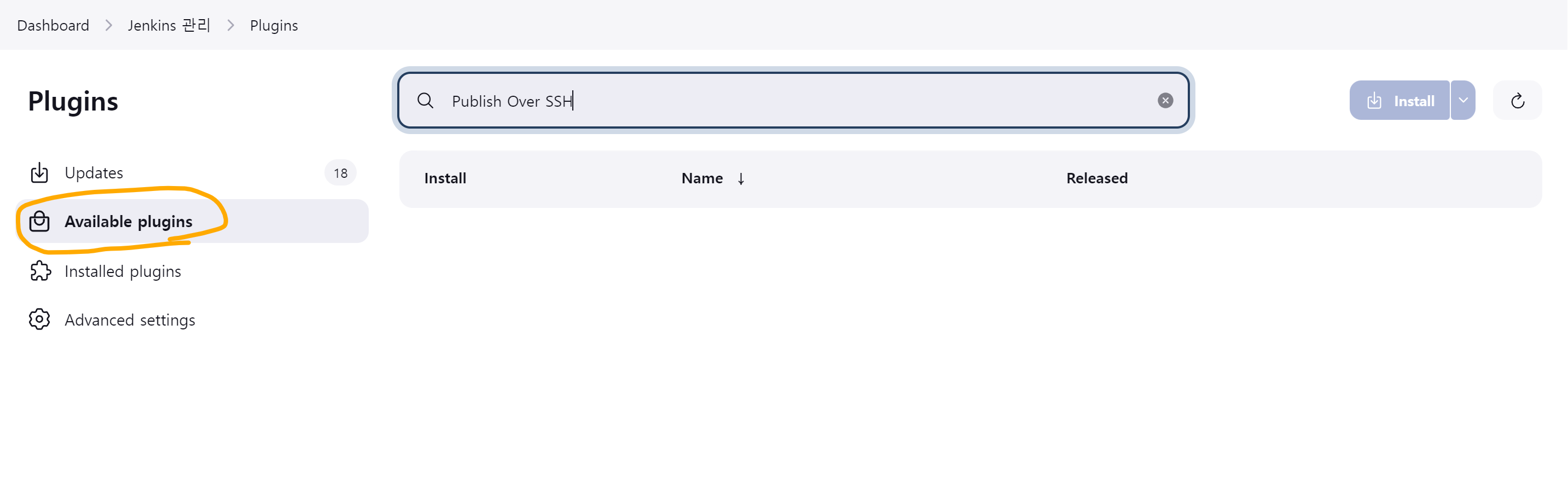 Available plugins 선택 -> Publish Over SSH 검색하고 우측 상단에 Install을 누른다.