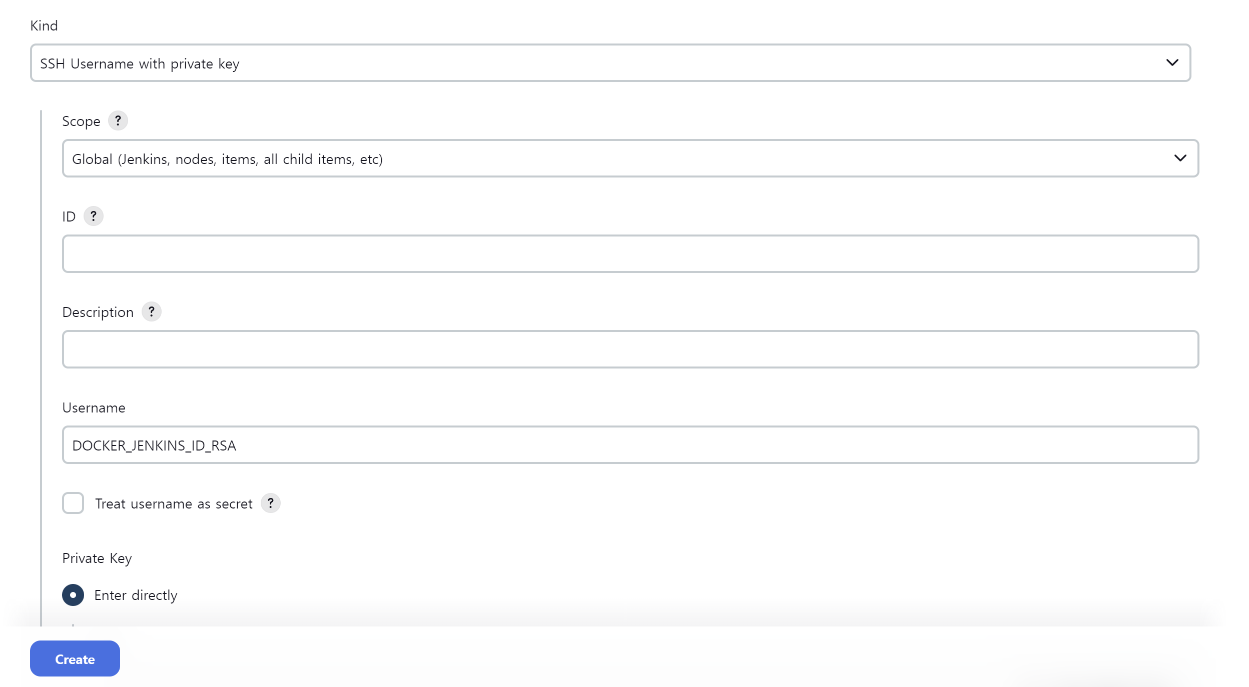 Key: 미리 복사해둔 젠킨스 컨테이너 id_rsa 값